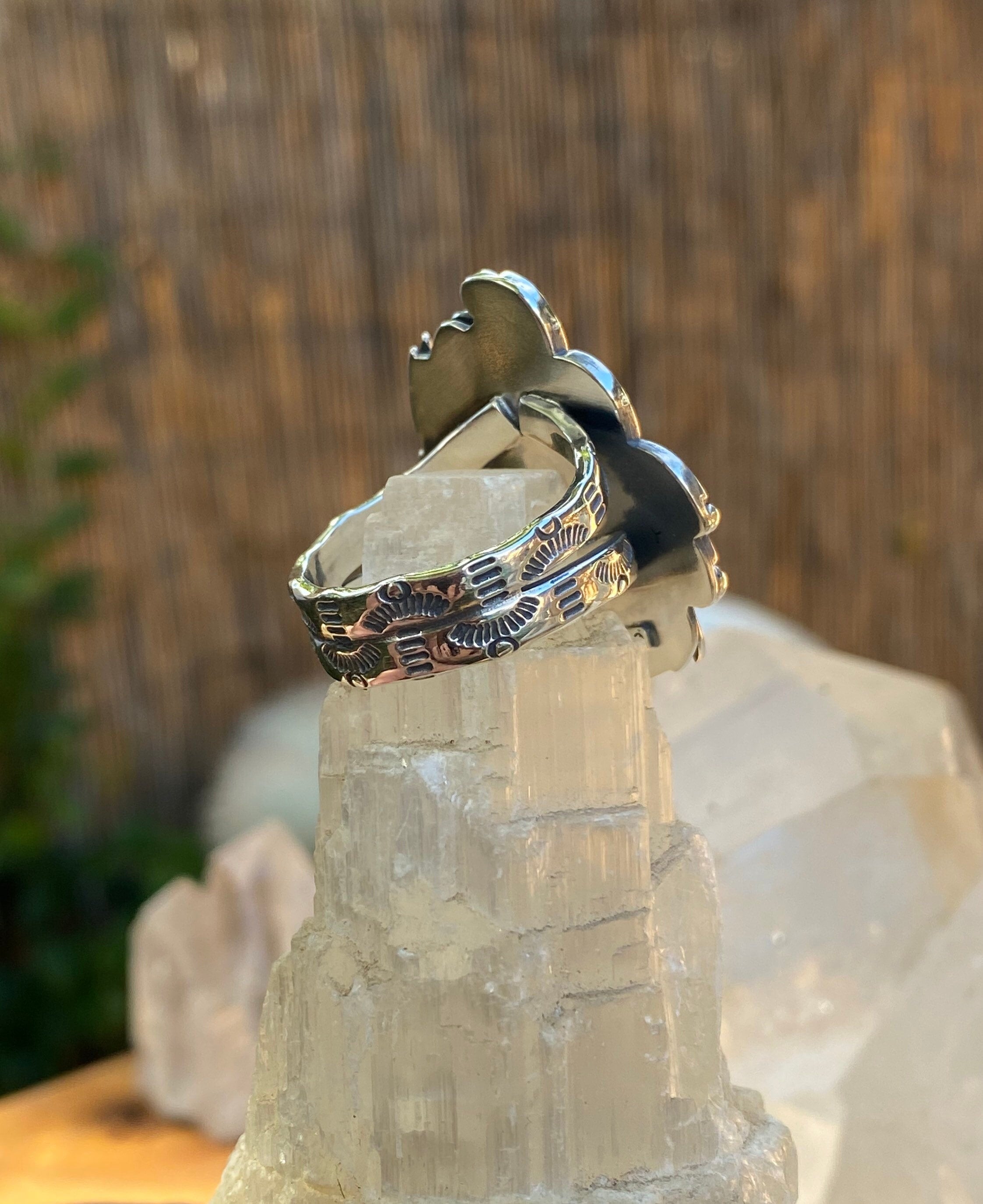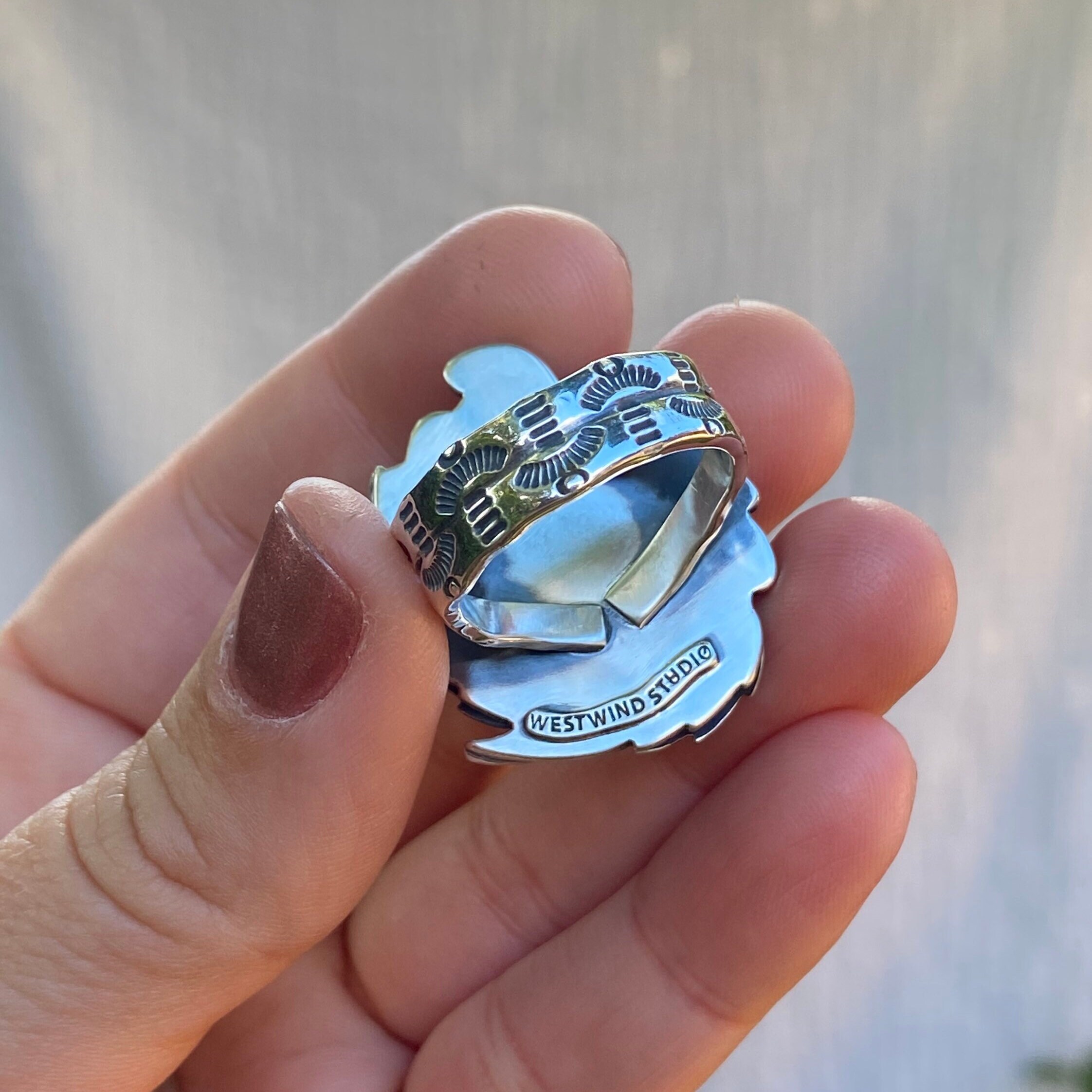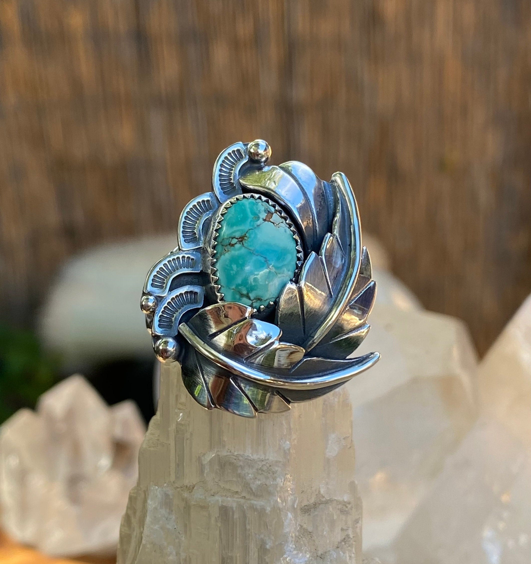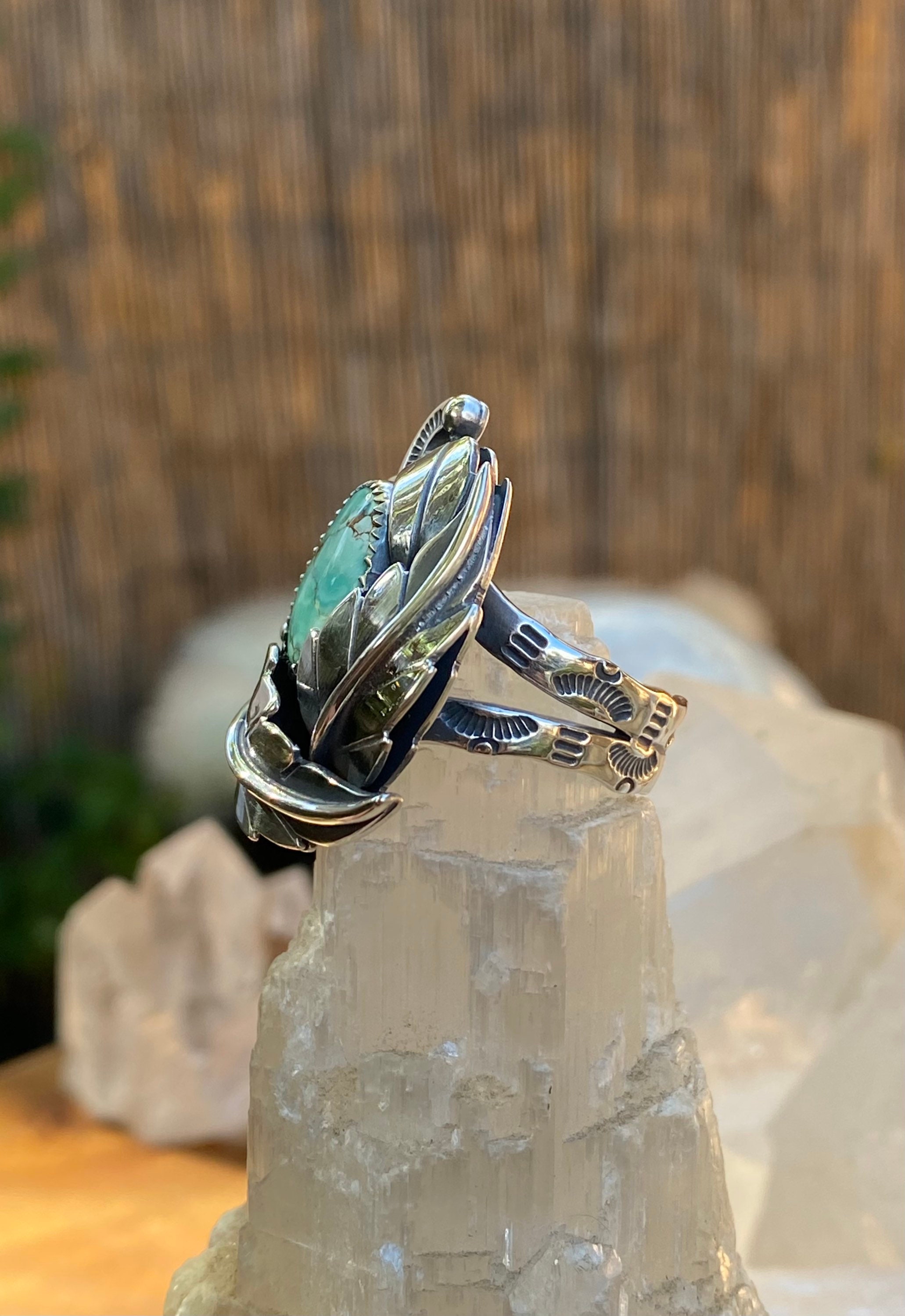 The Oasis Ring features handmade botanical leaves and stampings nestled around a unique and high grade piece of Royston Turquoise. It was designed to feel nostalgic yet timeless. It is accompanied by a thick split-shank, hand stamped band with a low sun-ray motif carried throughout the piece. It is a hearty statement piece but easy to wear for everyday. It was handmade in my home studio using solid sterling silver and finished with a high shine. Size 9.