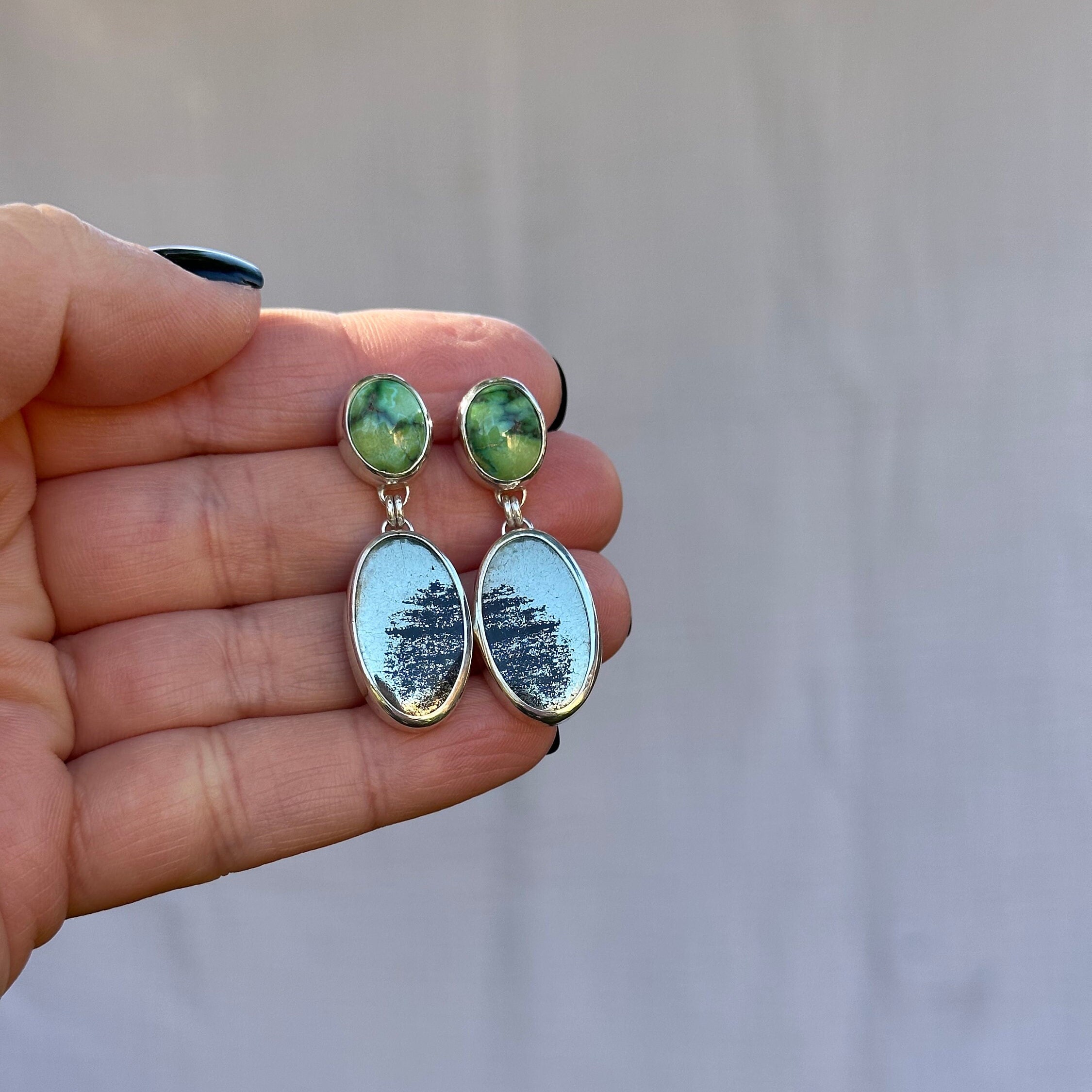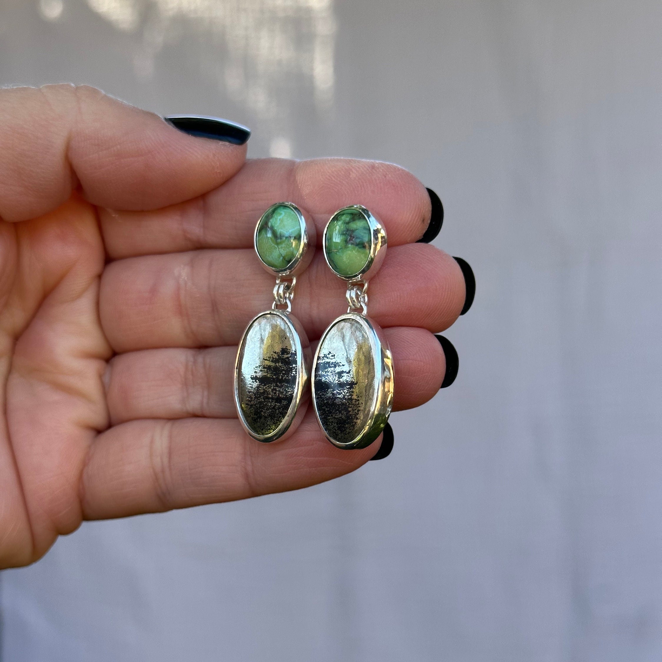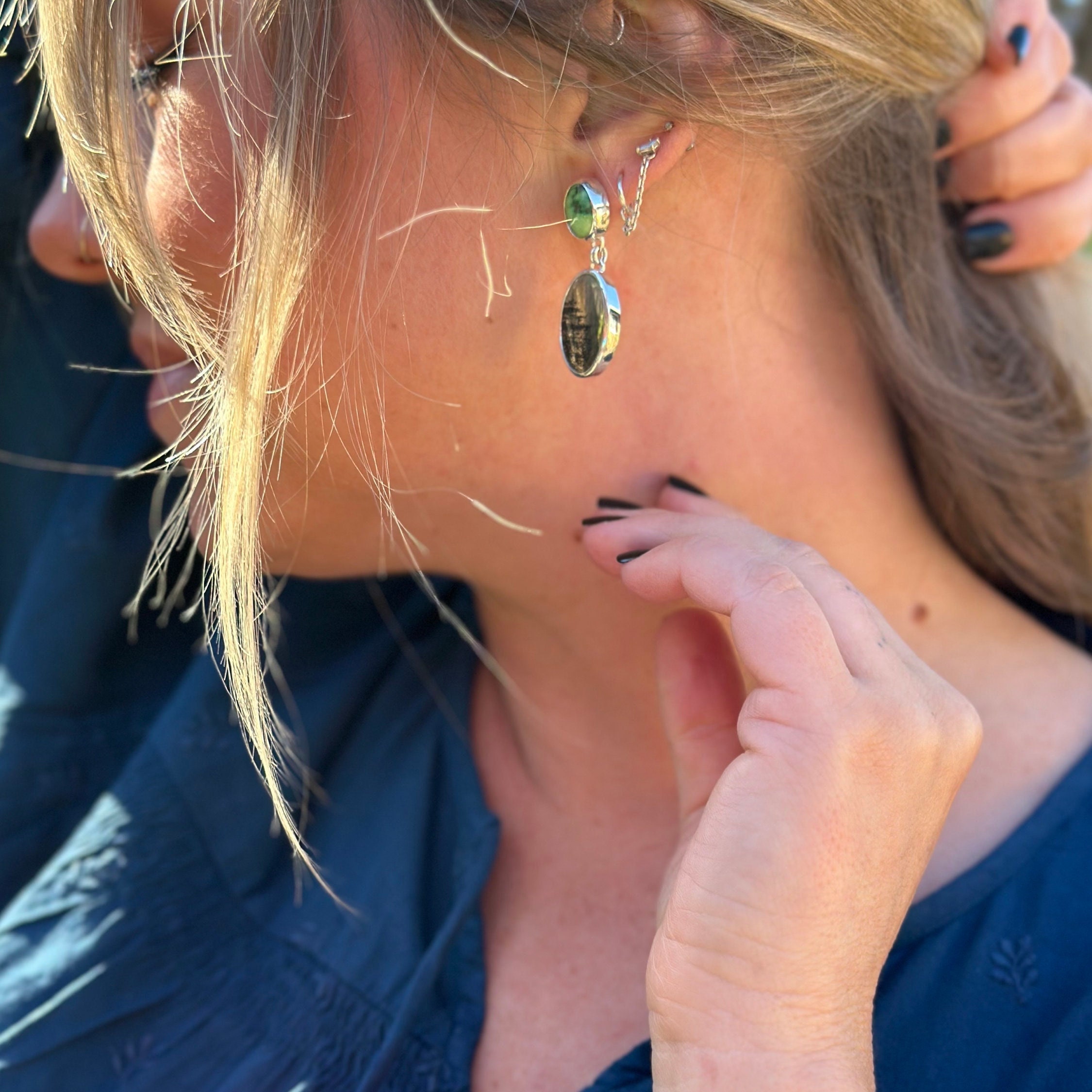 The Stardust Earrings are a match made in heaven! Stunning bright green Verde Valley Turquoise stones comprise the top of the stud earrings. Dangling below them are rare Apace Gold ovals. Apache Gold is found in Jerome, Arizona and consists of a black host rock (Chlorite Schist) and Chalcopyrite (Golden Pyrite) a high grade copper ore.