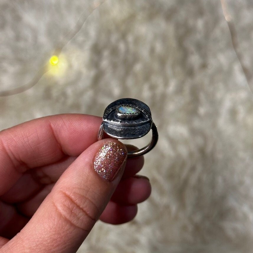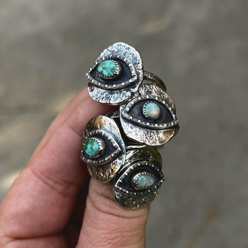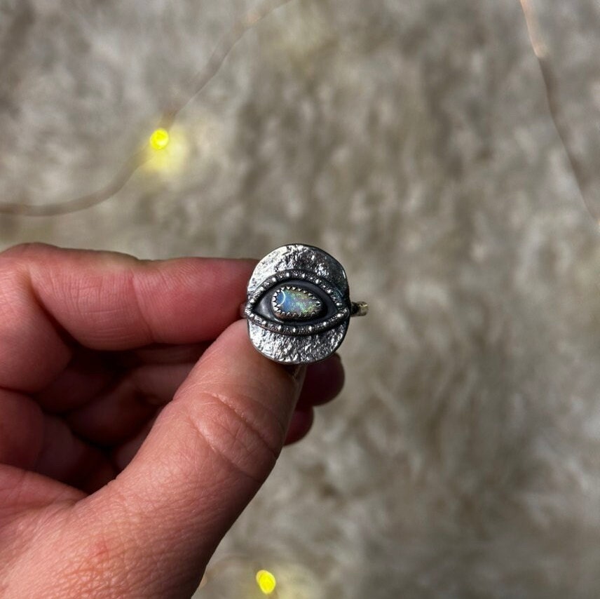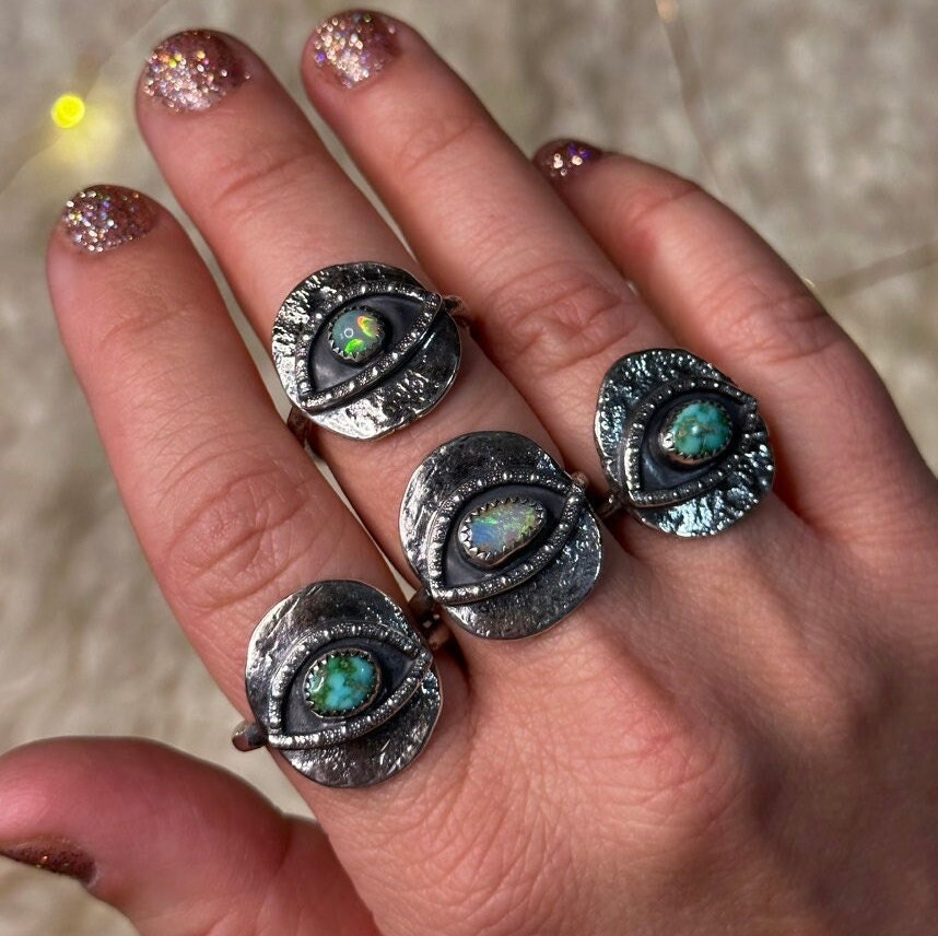 The Melted Eye ring was intended to feel old. As if it were just unearthed from an ancient site- rugged and incredibly handcrafted. The top signet portion was hammered flat from a melted ball of silver, and the band was melted to the organic circle instead of traditionally soldered. The process of melting the pieces together gave the silver its own unique texture and shape. Absolutely one of a kind as no two will ever be alike. This one features a beaded eye with a small Crystal Pipe Opal in the center. It was hand forged in my home studio using solid sterling silver and finished with a high shine.