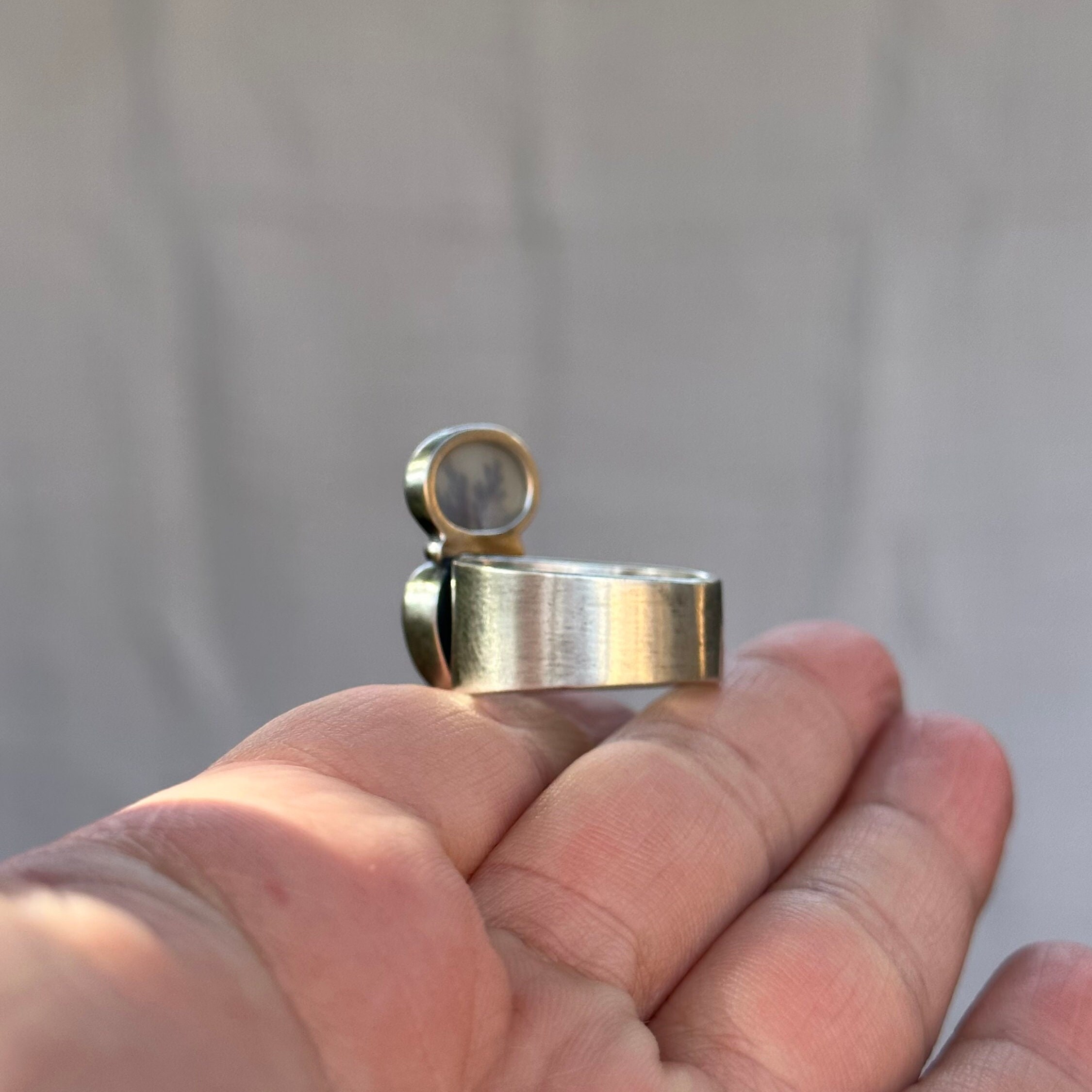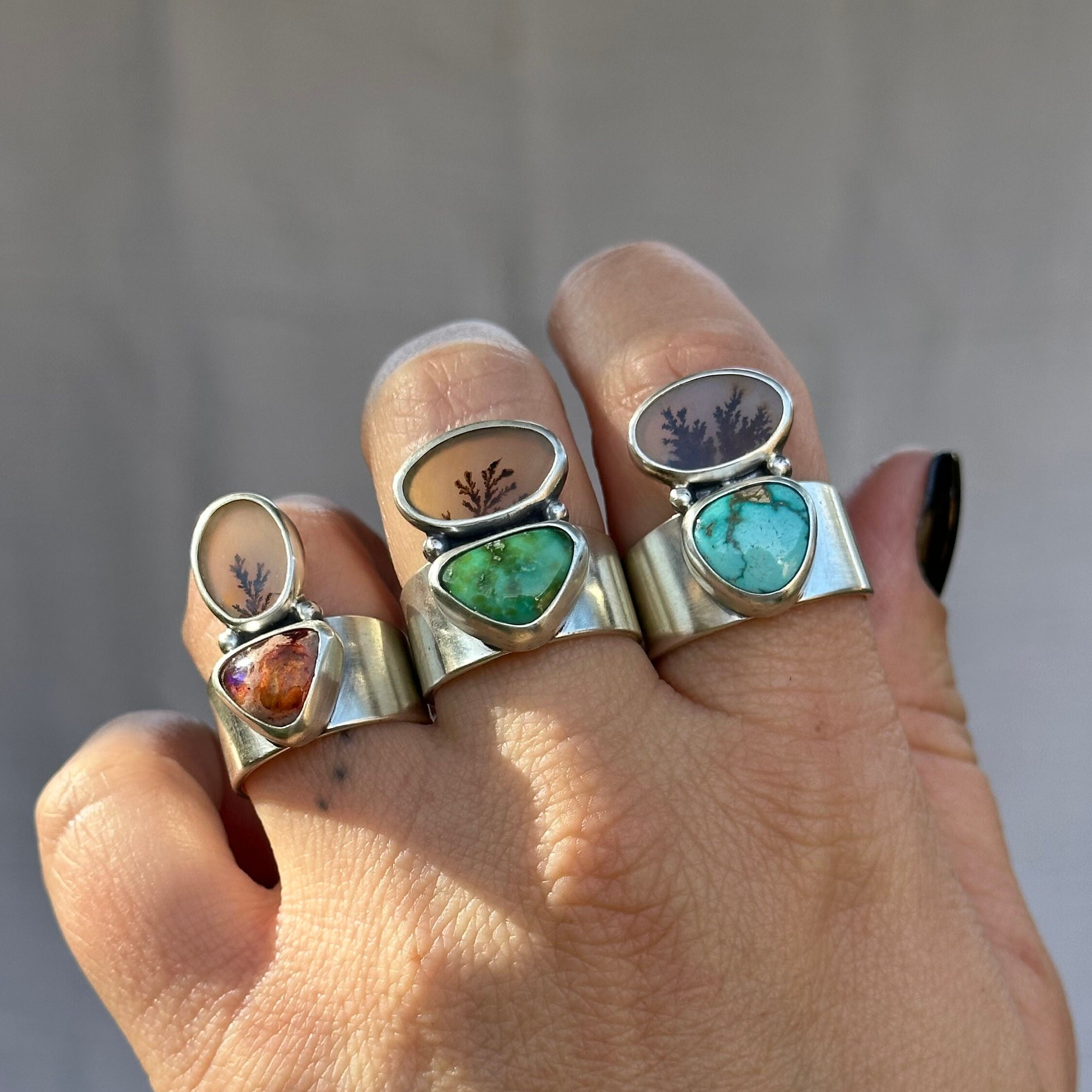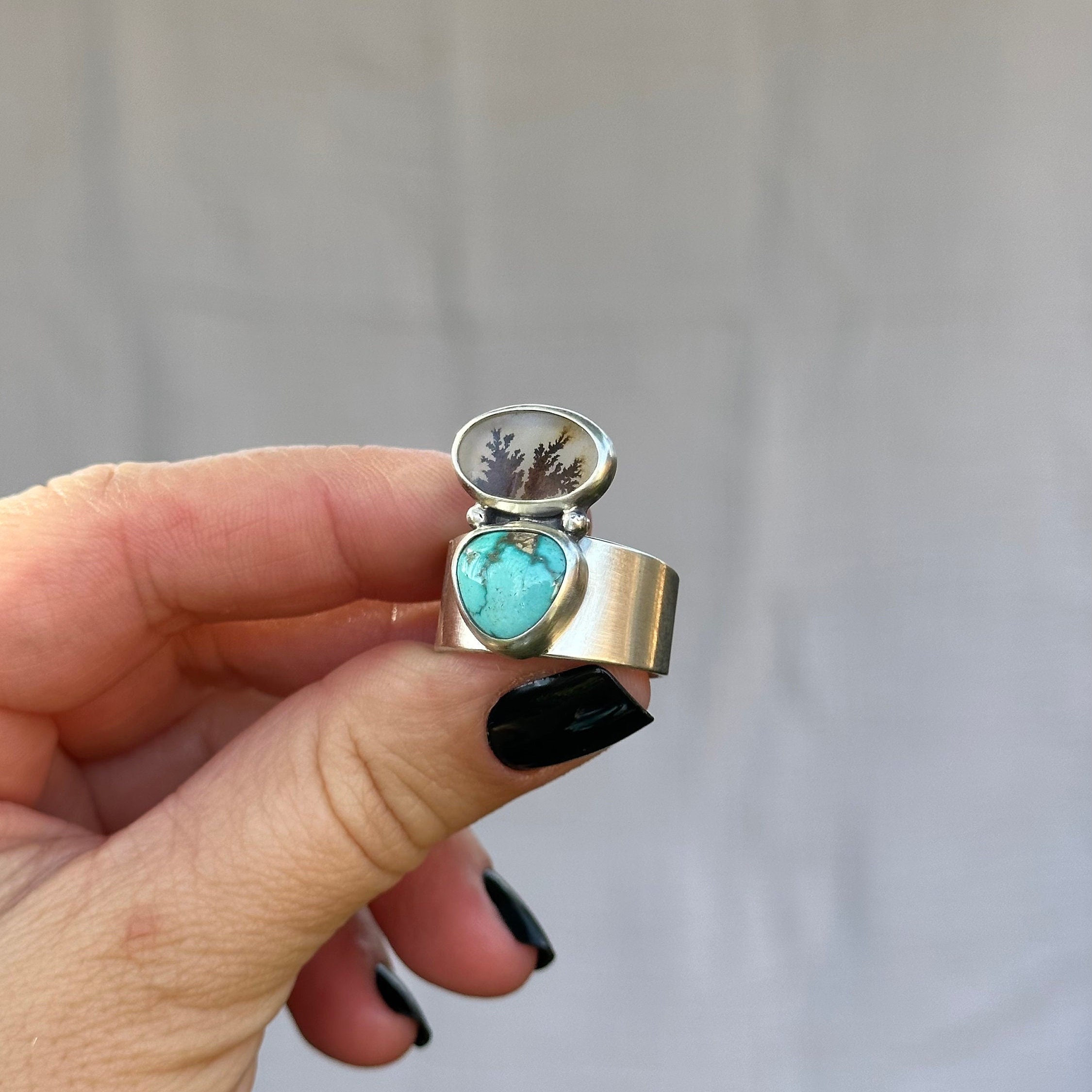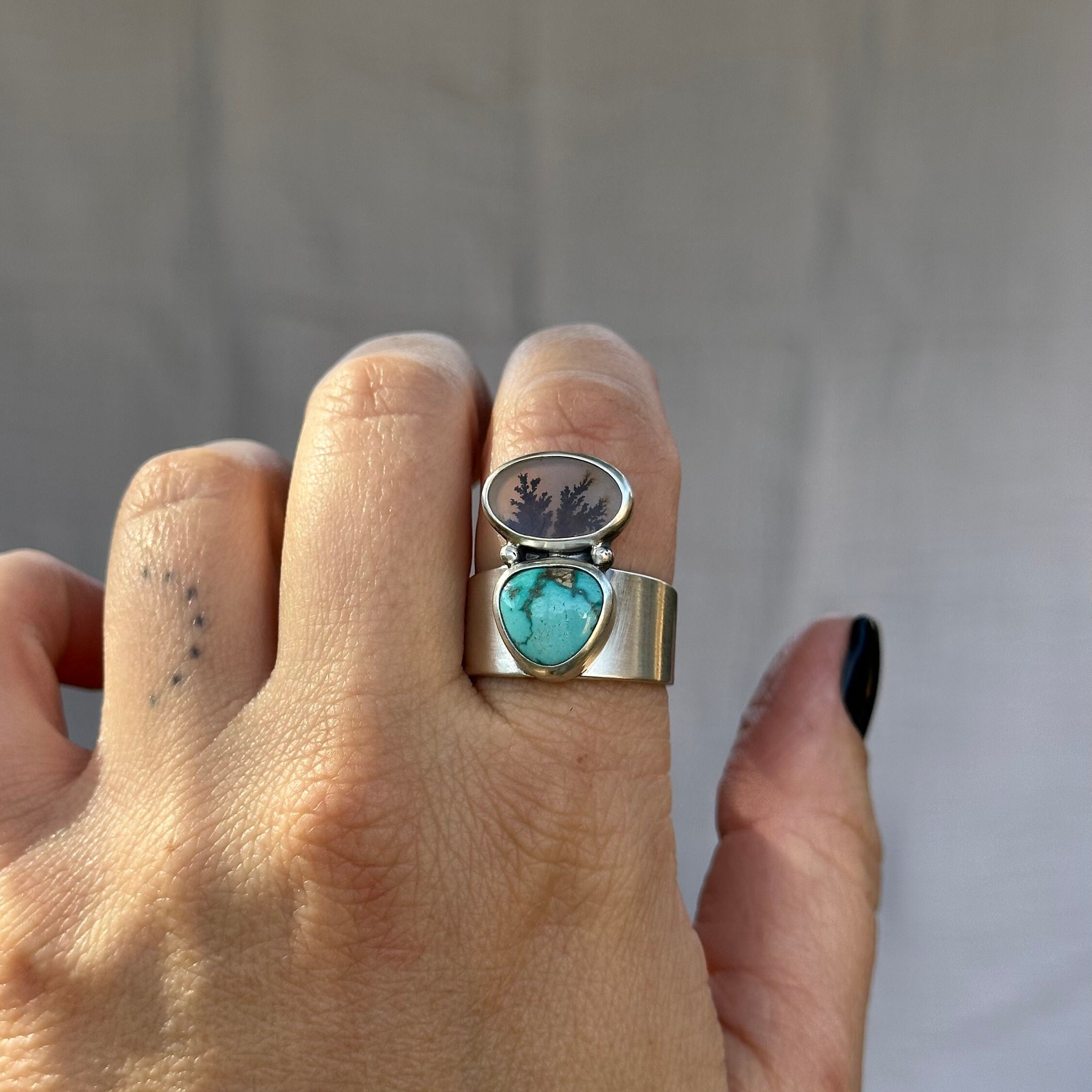 The Levitate ring features a dreamy duo of Dendritic Agate and Carico Lake Turquoise. They sit off center a smooth and comfortable, slightly tapered wide band. The back of the agate stone is cut out to let the light shine through and emulate a -floating on your finger- feeling. It was handcrafted in my home studio using entirely solid sterling silver and finished with a satin finish. Fits a size 9 - 9.25.
