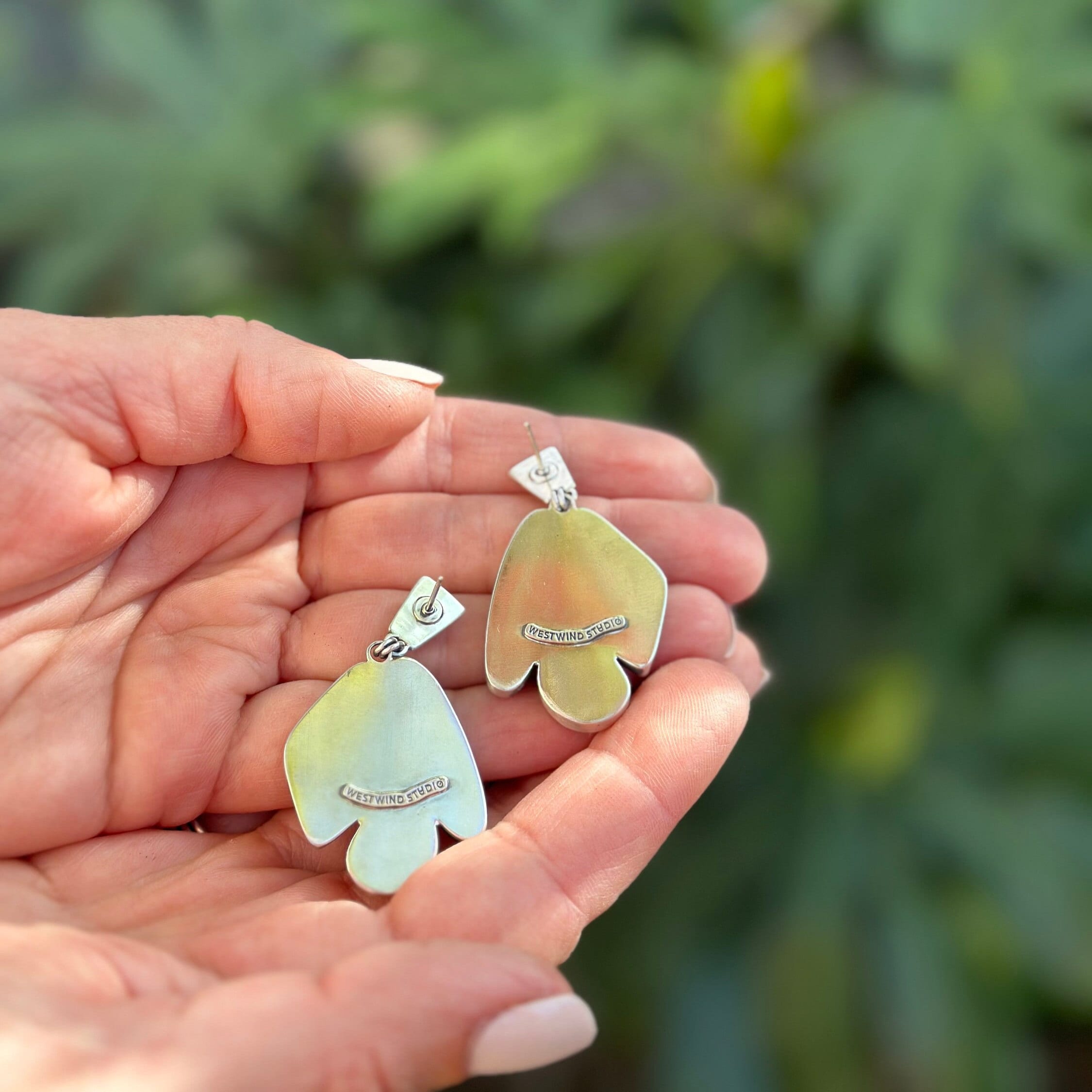 They are arranged in an asymmetric fan shape that was inspired by the stud portion of the earrings. The studs feature a motif that was created by hammering a silver ball into an antique brass plate to create the pieces.