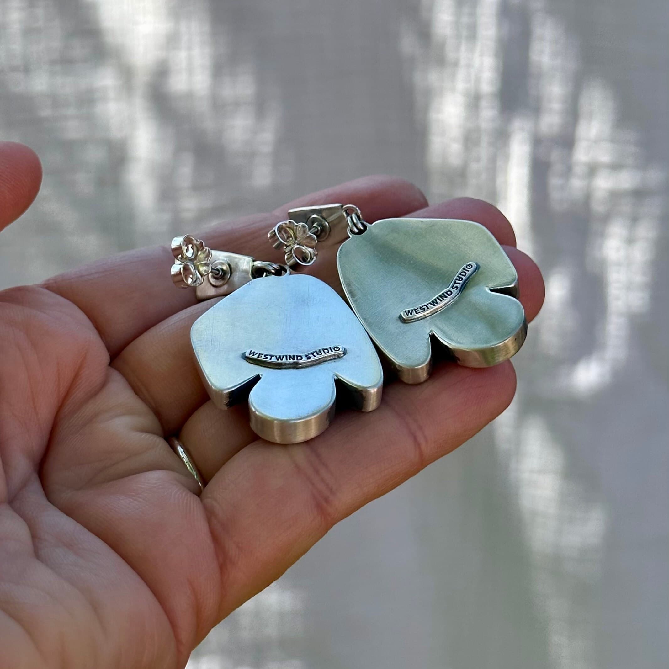 They were entirely handmade in my home studio using solid sterling silver and finished with a low shine. They come with sterling silver ear clasps and bear the makers mark on the back.