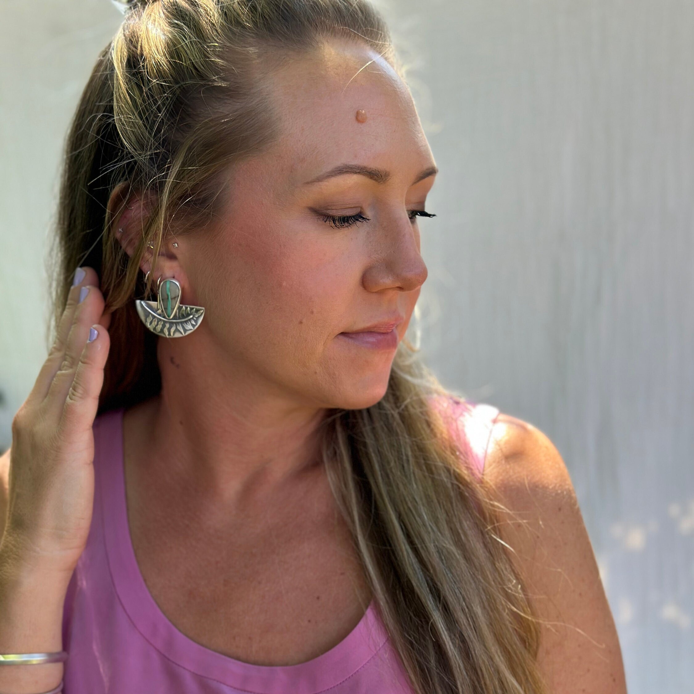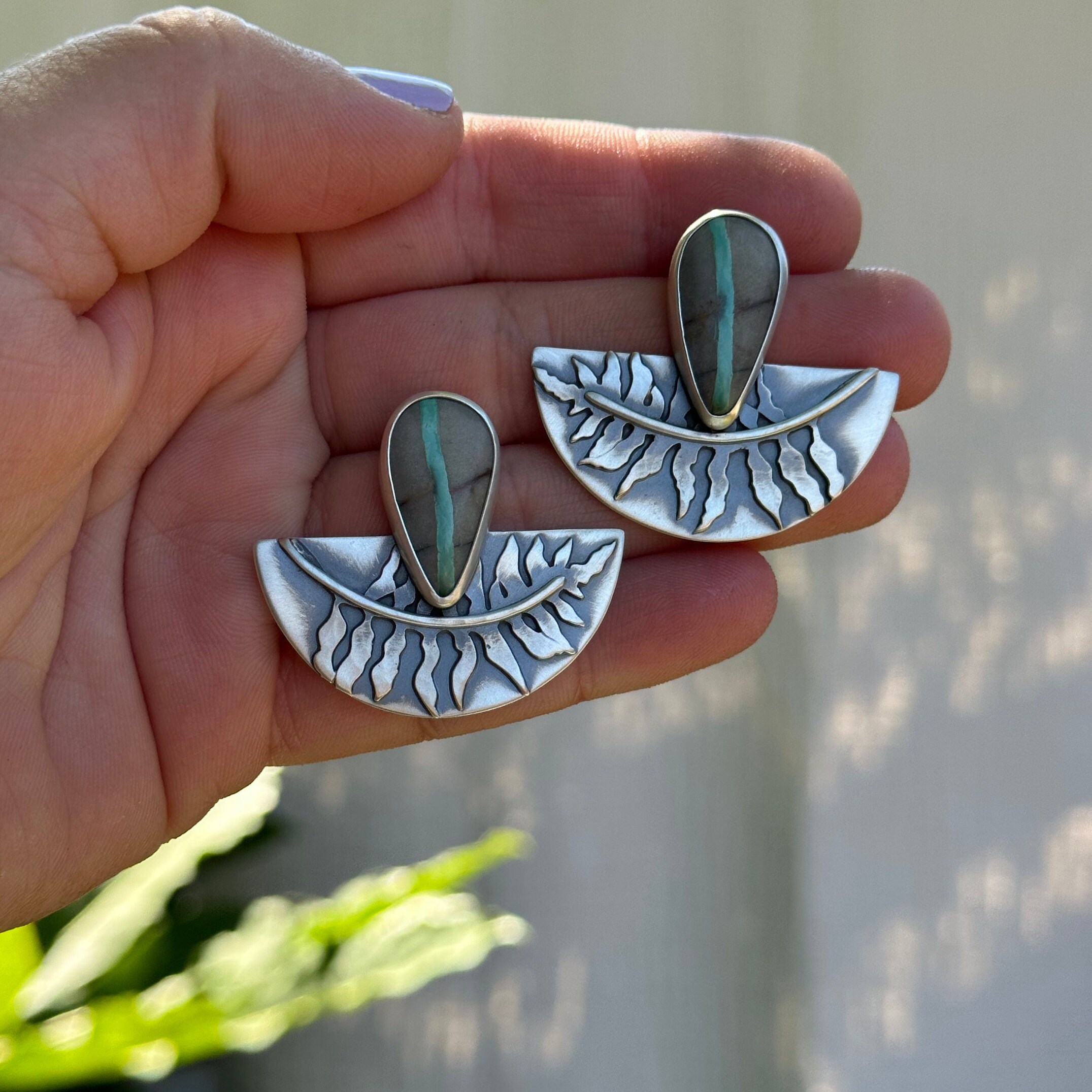 The Fern fan earrings feature large hand sawn ferns that have been overlayed onto large half circles. Above the half circles are gorgeous Royston ribbon Turquoise stones in a stunning shade of teal that runes through the grey hot rock. They fit comfortably on the ear despite their size. They were entirely handcrafted in my home studio using solid sterling silver and finished with a smooth satin finish. They also some with large sterling silver earrings backs. They measure 1 1/2" wide by almost 1 1/2" long. They will ship promptly in a jewelry box and pouch for gifting to yourself or someone else! Wear often!
