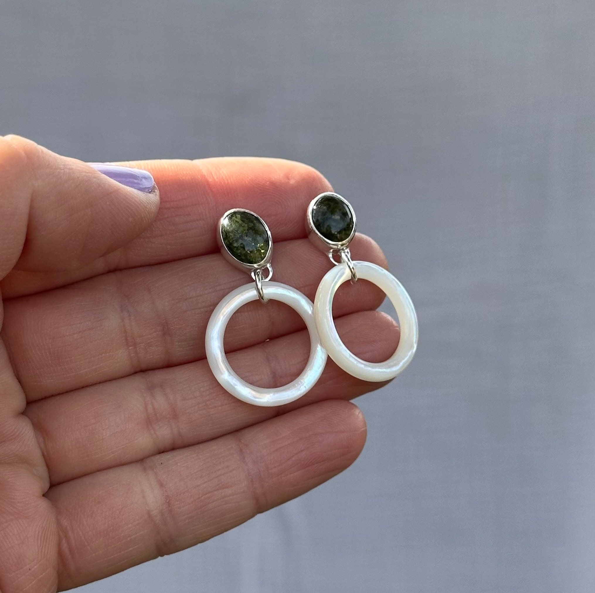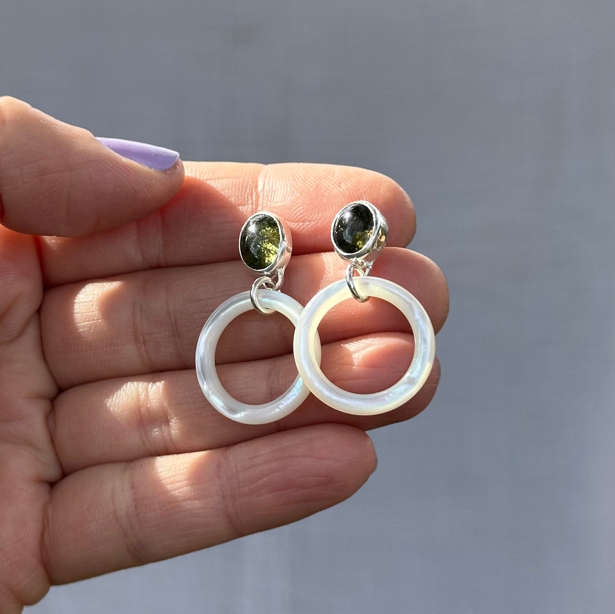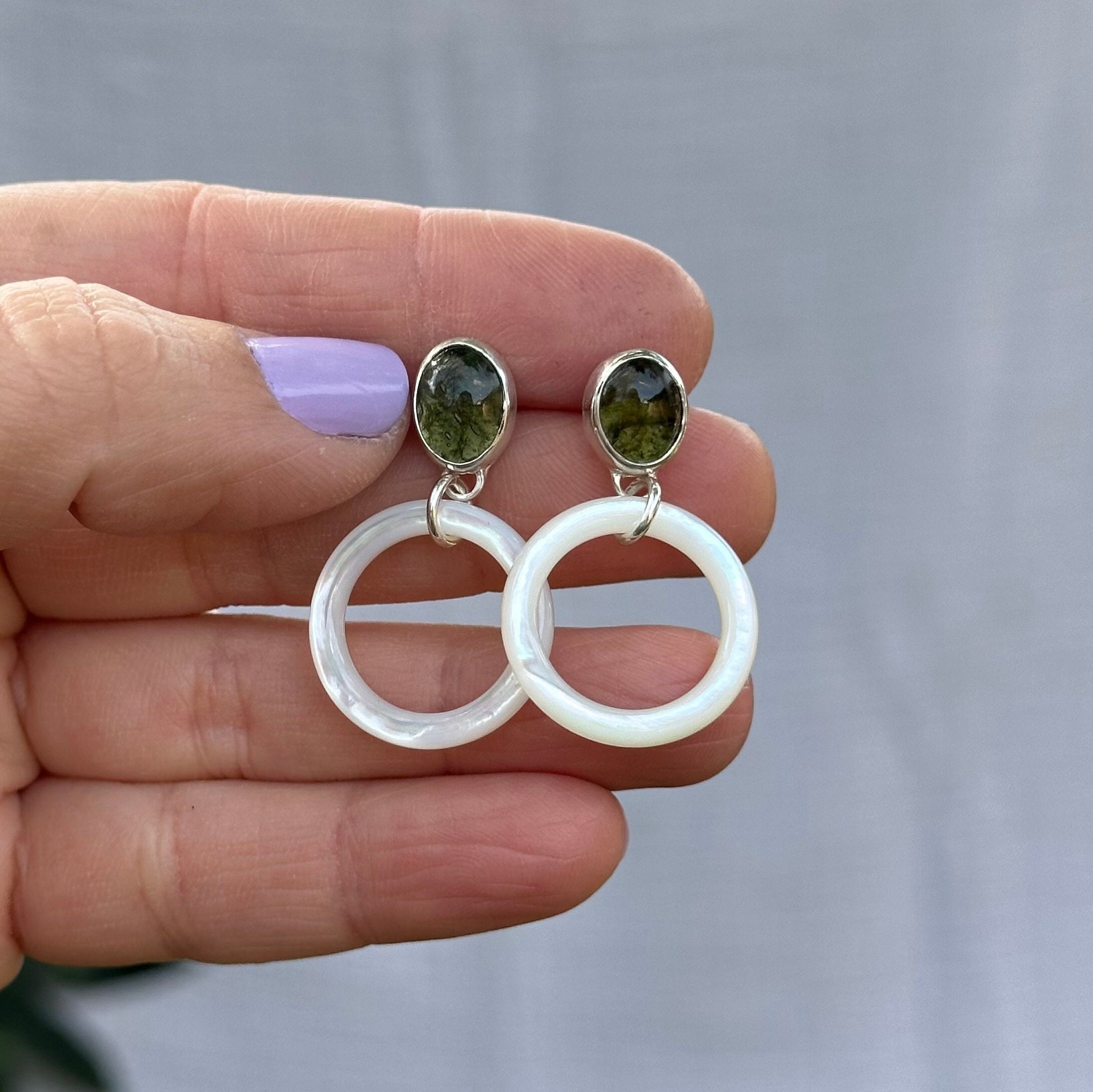 These dainty hoops feature Moldavite studs at the top joined with solid Mother of Pearl circles to create the perfect glowy everyday earring!