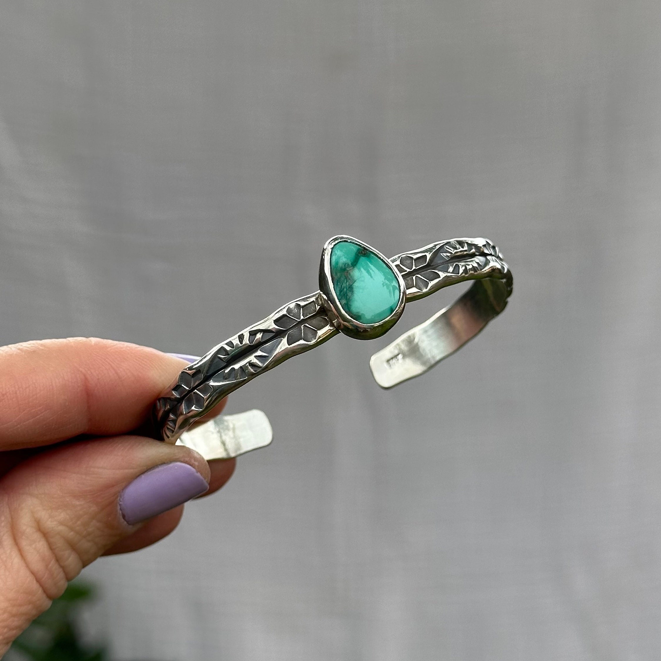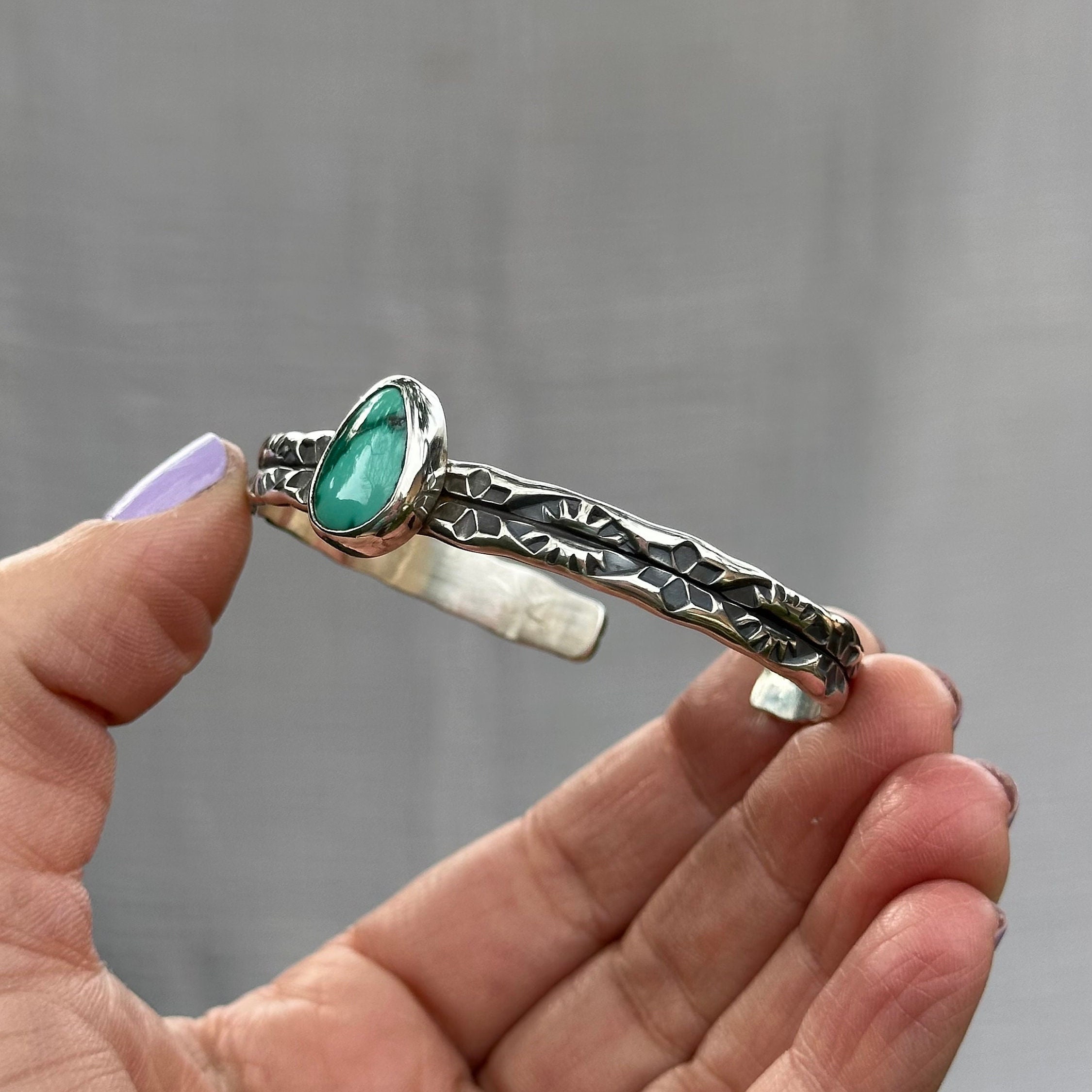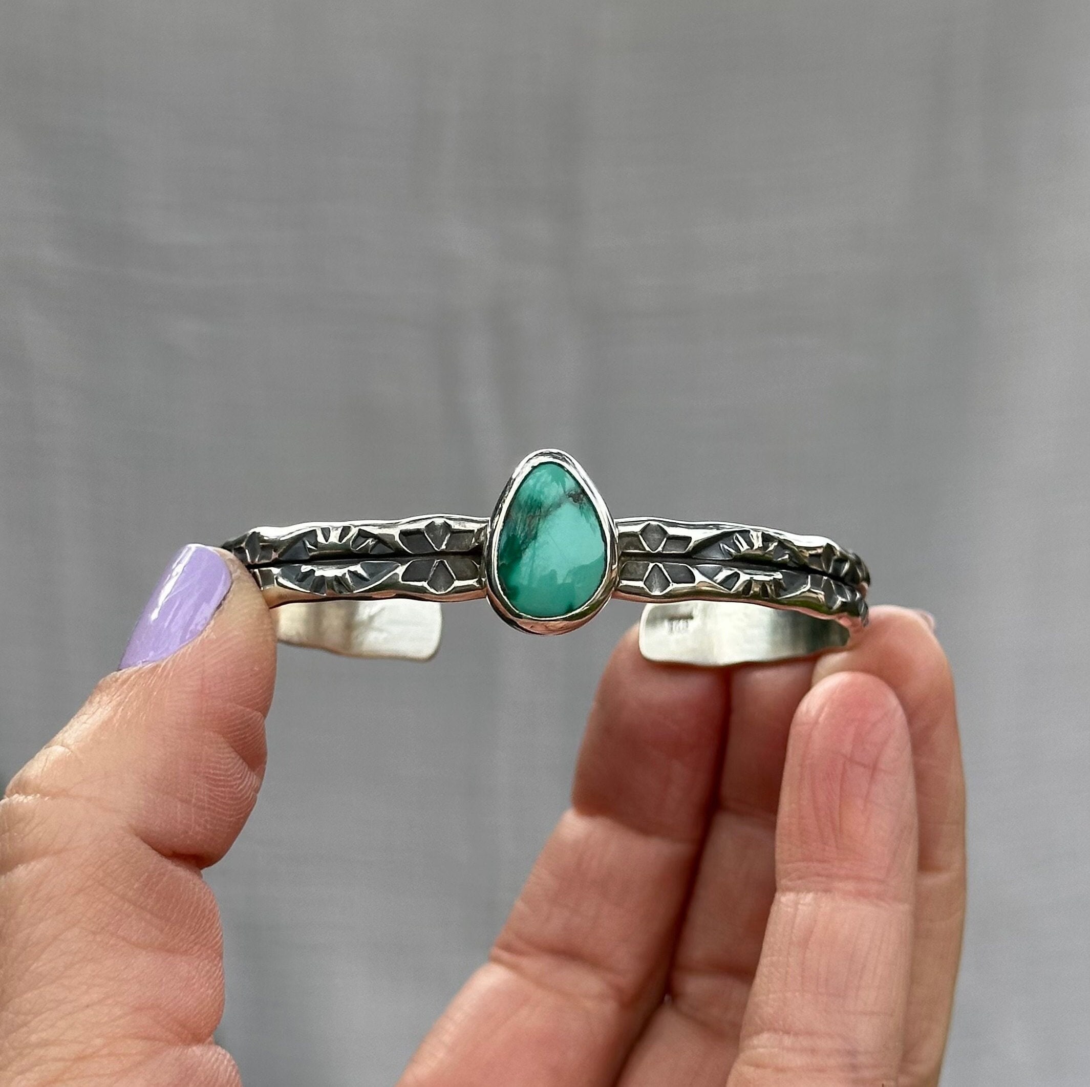 This chunky statement piece features a unique hand stamped design into a thick double wide sterling silver cuff. Resting on top of the sturdy cuff band is a stunning Emerald Valley Turquoise stone. The Cuff was entirely handmade in my studio using solid sterling silver and finished with a high shine.