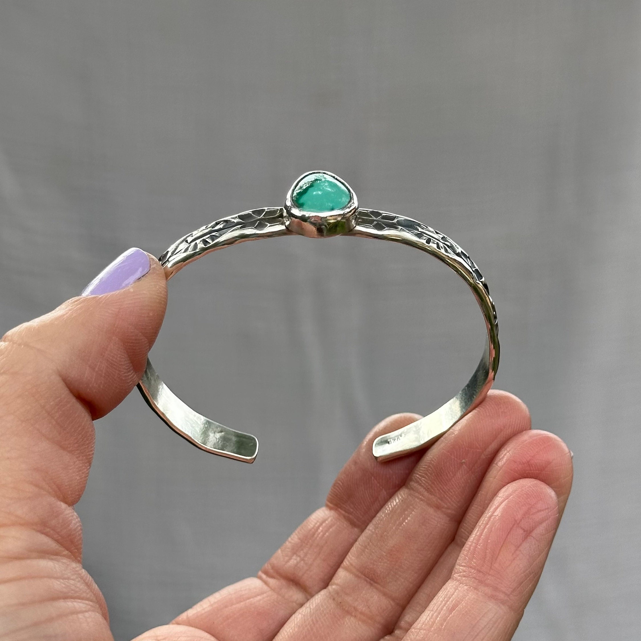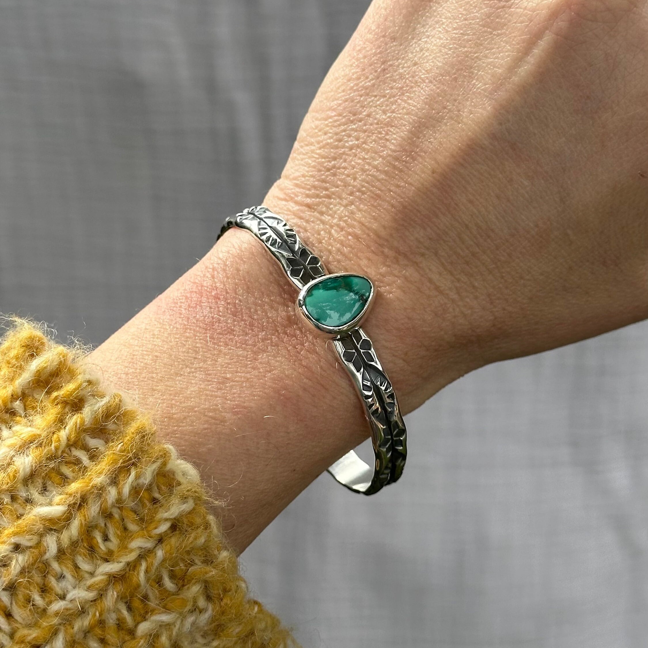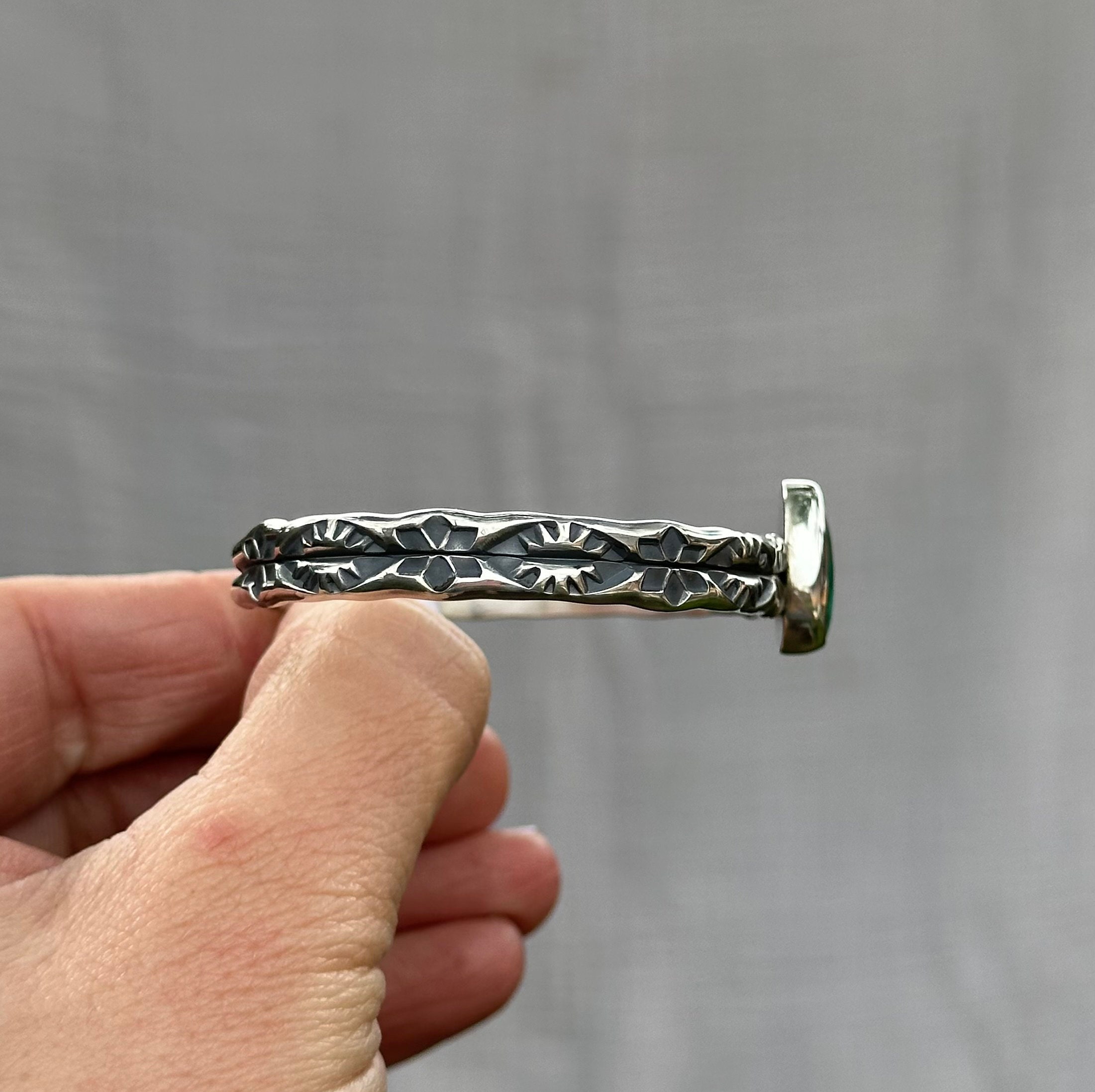 This chunky statement piece features a unique hand stamped design into a thick double wide sterling silver cuff. Resting on top of the sturdy cuff band is a stunning Emerald Valley Turquoise stone. The Cuff was entirely handmade in my studio using solid sterling silver and finished with a high shine.