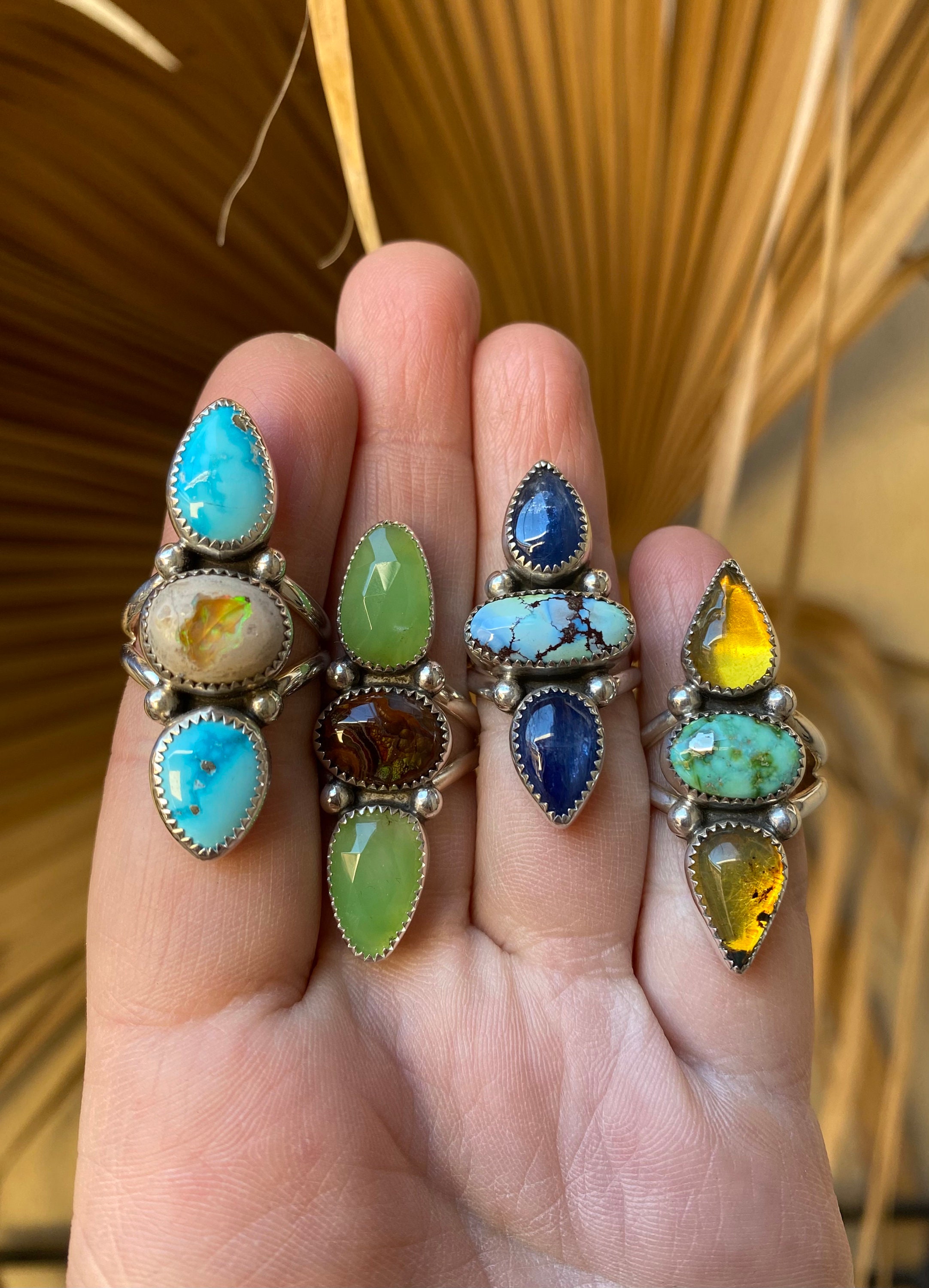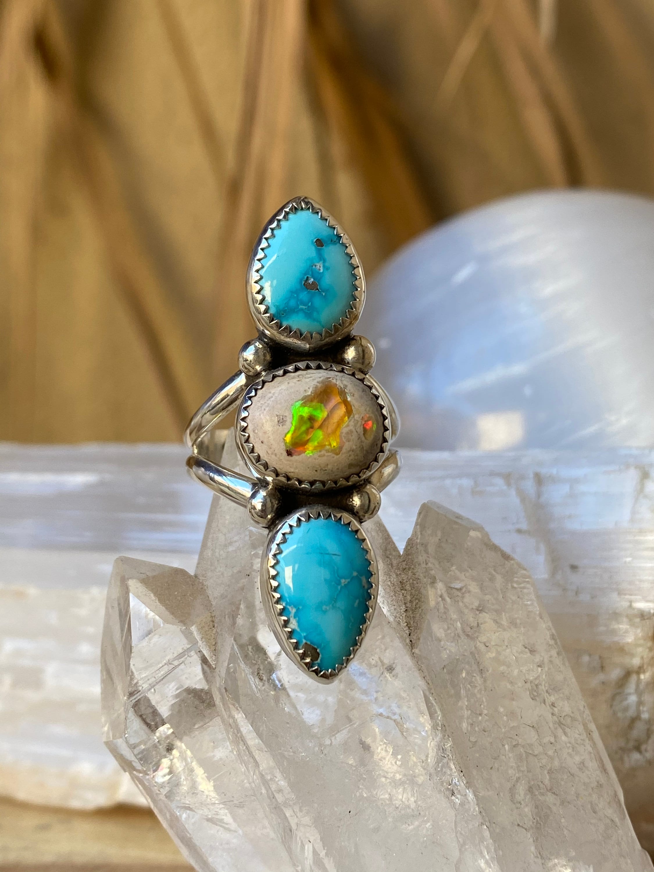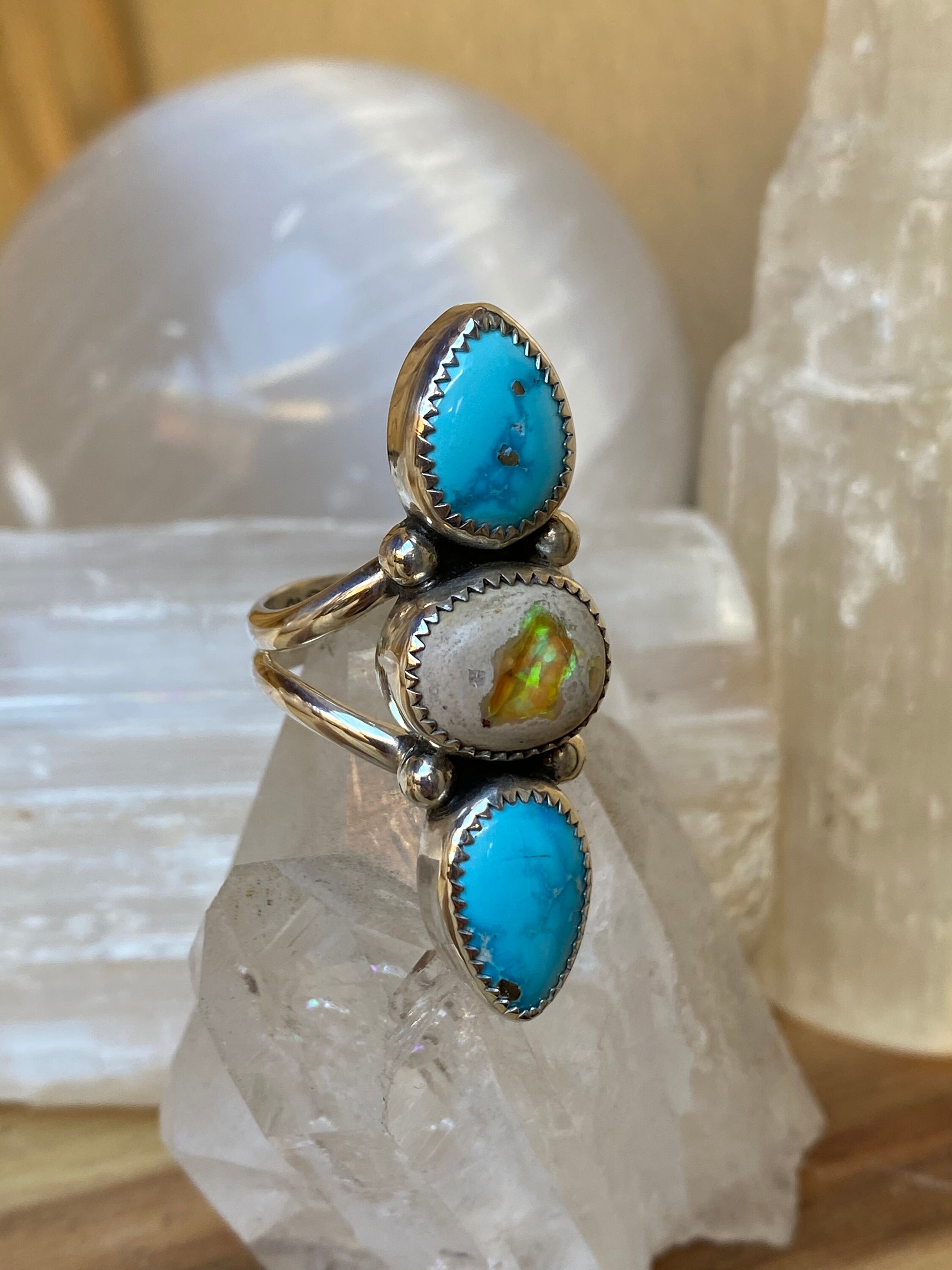This petite triple stone ring features bright Blue Ridge Turquoise stones on the top and bottom with a fiery Mexican Cantera Opal in the center. It comes with a comfortable split shank band in a size 6.5. The entire piece was handcrafted with .925 sterling silver and finished with a high shine polish.