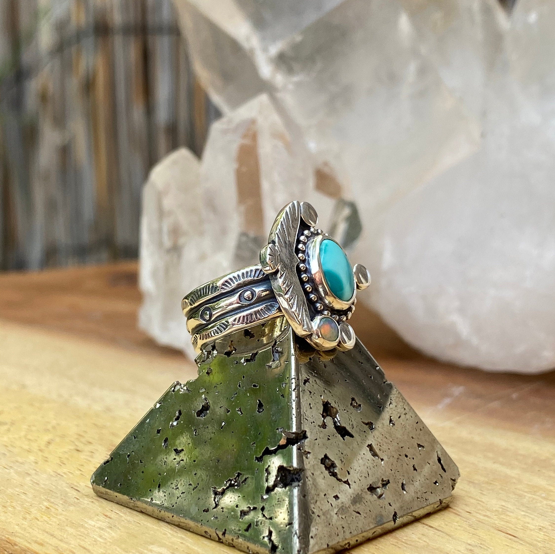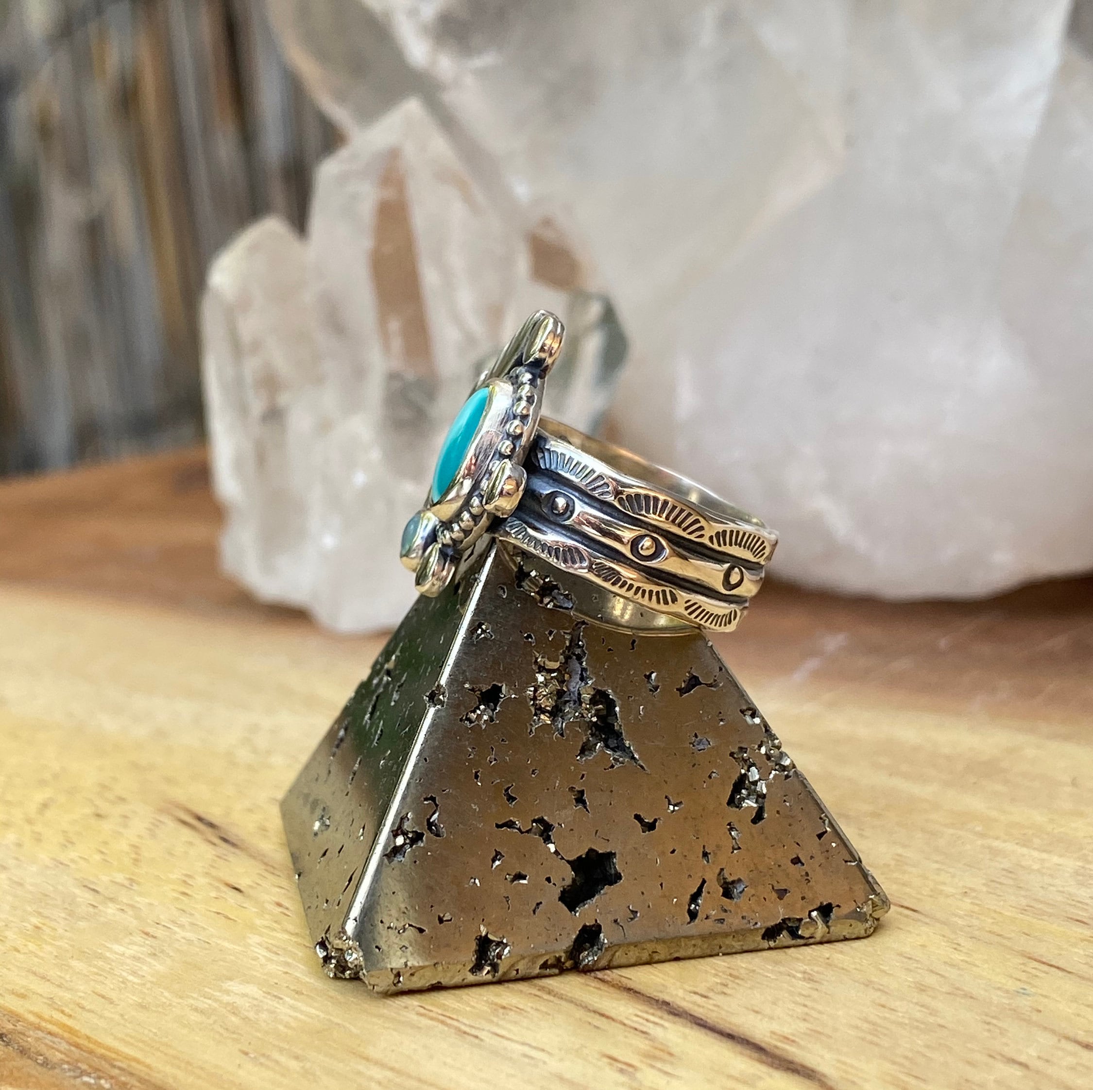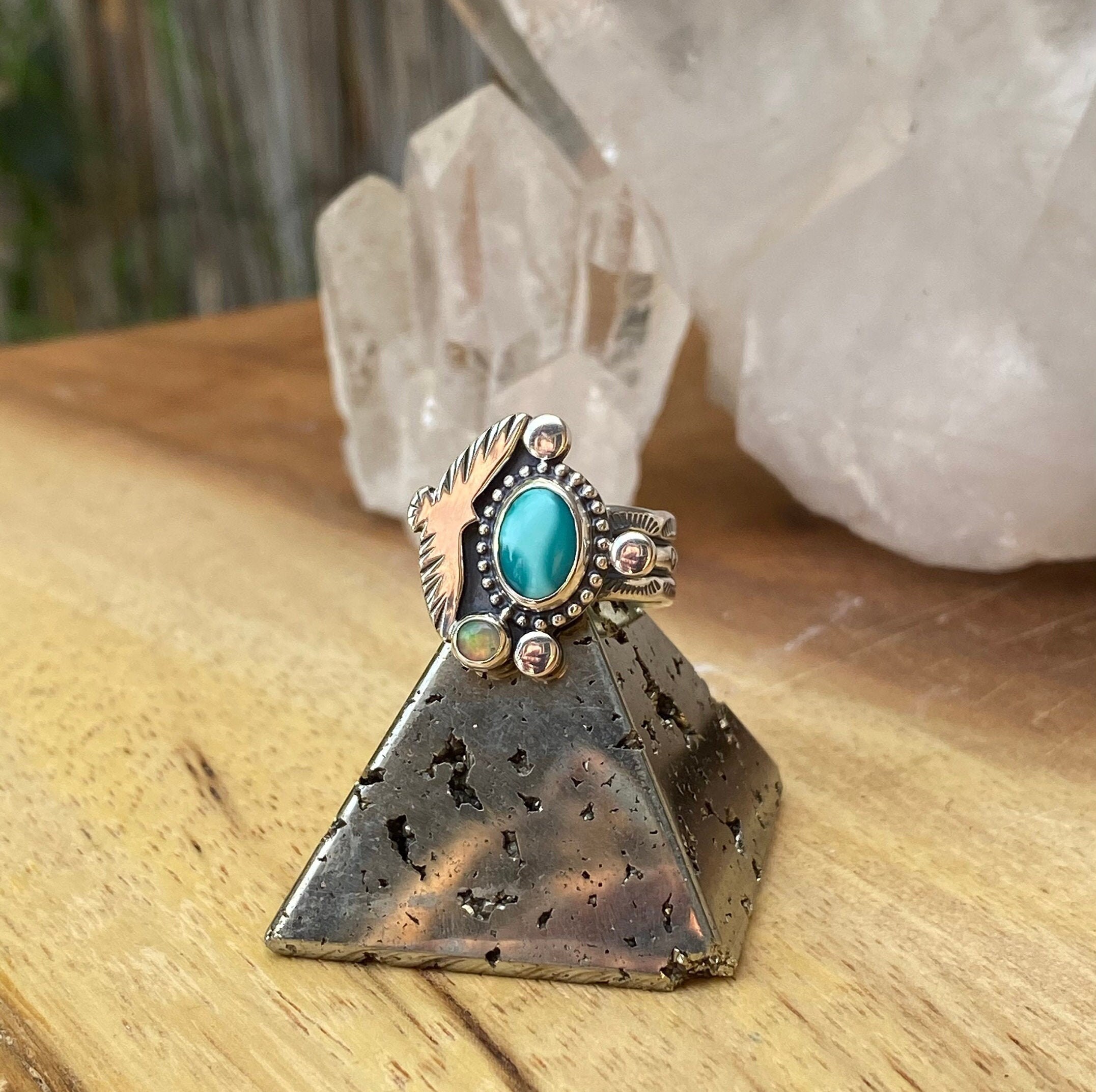 The Miramar Ring features a gorgeous vintage Fox Turquoise stone surrounded by tiny beads and larger dots at North, South, & East. To the West is a hand sawn bird flying into the stone with a complimenting 4mm solid Ethiopian Opal below it. It also has a decorative hand stamped triple wire band in a Size 6. The entire ring was hand crafted using solid sterling silver and was finished with a high shine.
